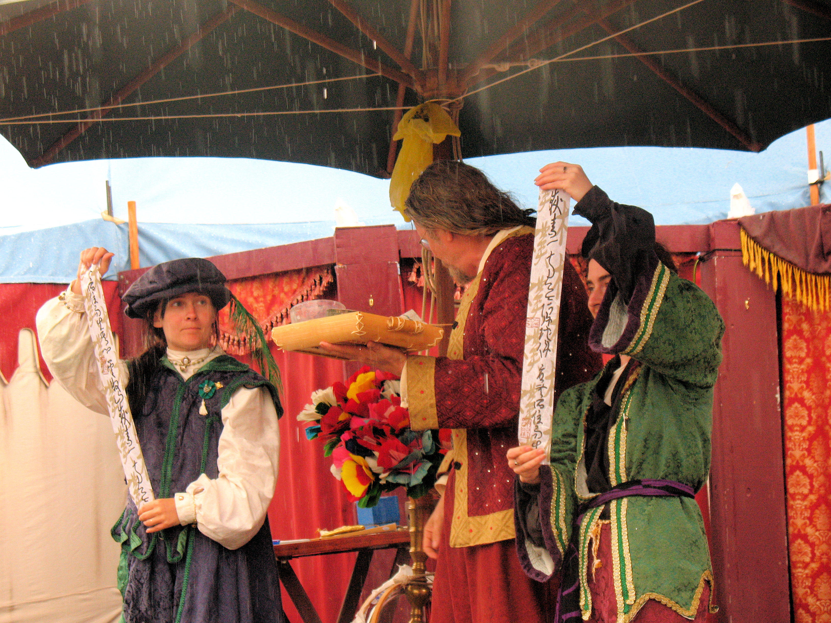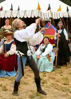 All our themes and references are based in the Tudor Era. Our costumes are adaptations of period pieces modified for performing. We often comment on props and costume's "uniqueness" from a 21st century eye. We strive to add "education" to our entertainment. "Basic Faire Accent (BFA)" and Old English words are liberally sprinkled throughout the show. However, we do recognize that most of our audiences don't speak BFA and translation into 21st century American English is needed. We time travel as magically based characters and logically act as translators and guides to the 15th - 16th century.